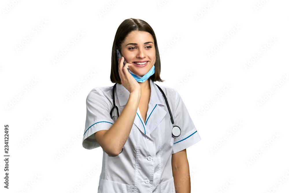 Lady Doctor Talking On Cell Phone Portrait Of Smiling Female Physician Talking On Mobile Phone Over White Background Medical Service Concept Stock Photo Adobe Stock
